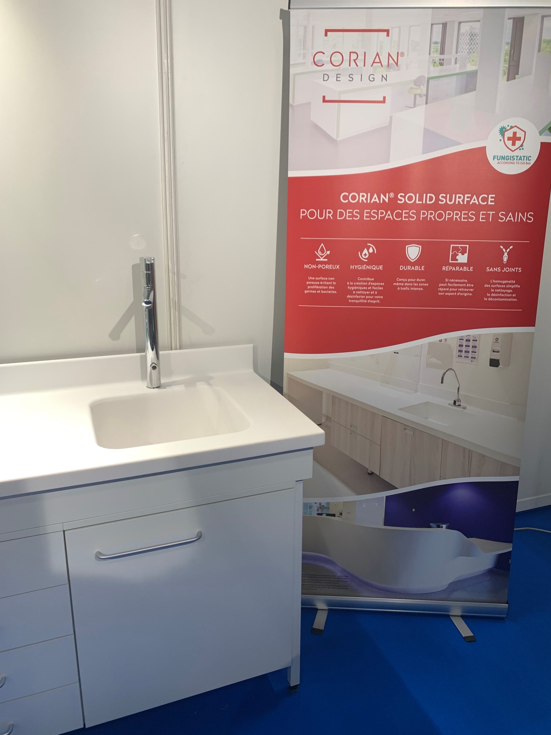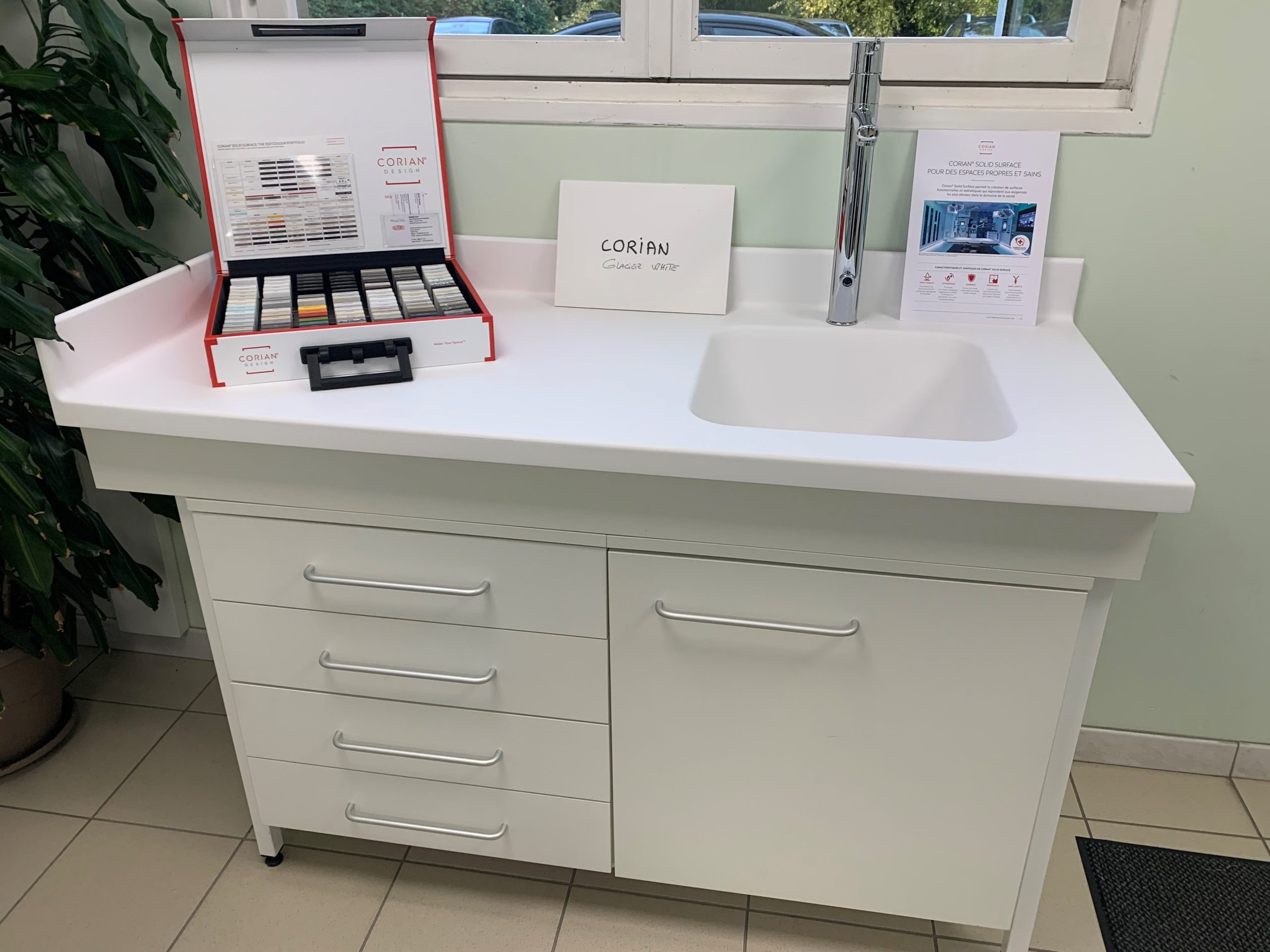 Corian® Solid Surface permet la création de surfaces fonctionnelles et esthétiques qui répondent aux exigences les plus élevées dans le domaine de la santé. Non poreux, Corian® a une surface non poreuse qui empêche la saleté et les taches de pénétrer dans le matériau. Sans joints, l’aspect homogène des plans de travail, des éviers et des équipements en Corian®, intégrés dans la surface, signifie qu’il n’y a pas de joints susceptibles de retenir les moisissures, les germes et les virus. En tant que matériau à très faible émission de composés organiques volatils (COV), Corian® Solid Surface est exempt de produits chimiques dangereux et contribue ainsi à améliorer la qualité de l’air intérieur et à obtenir la certification Green Building.